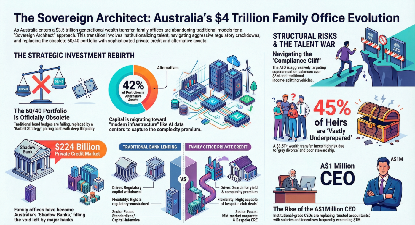 By providing capital for mid-market corporate lending and commercial property development, family offices have effectively become a parallel banking system for the Australian economy.